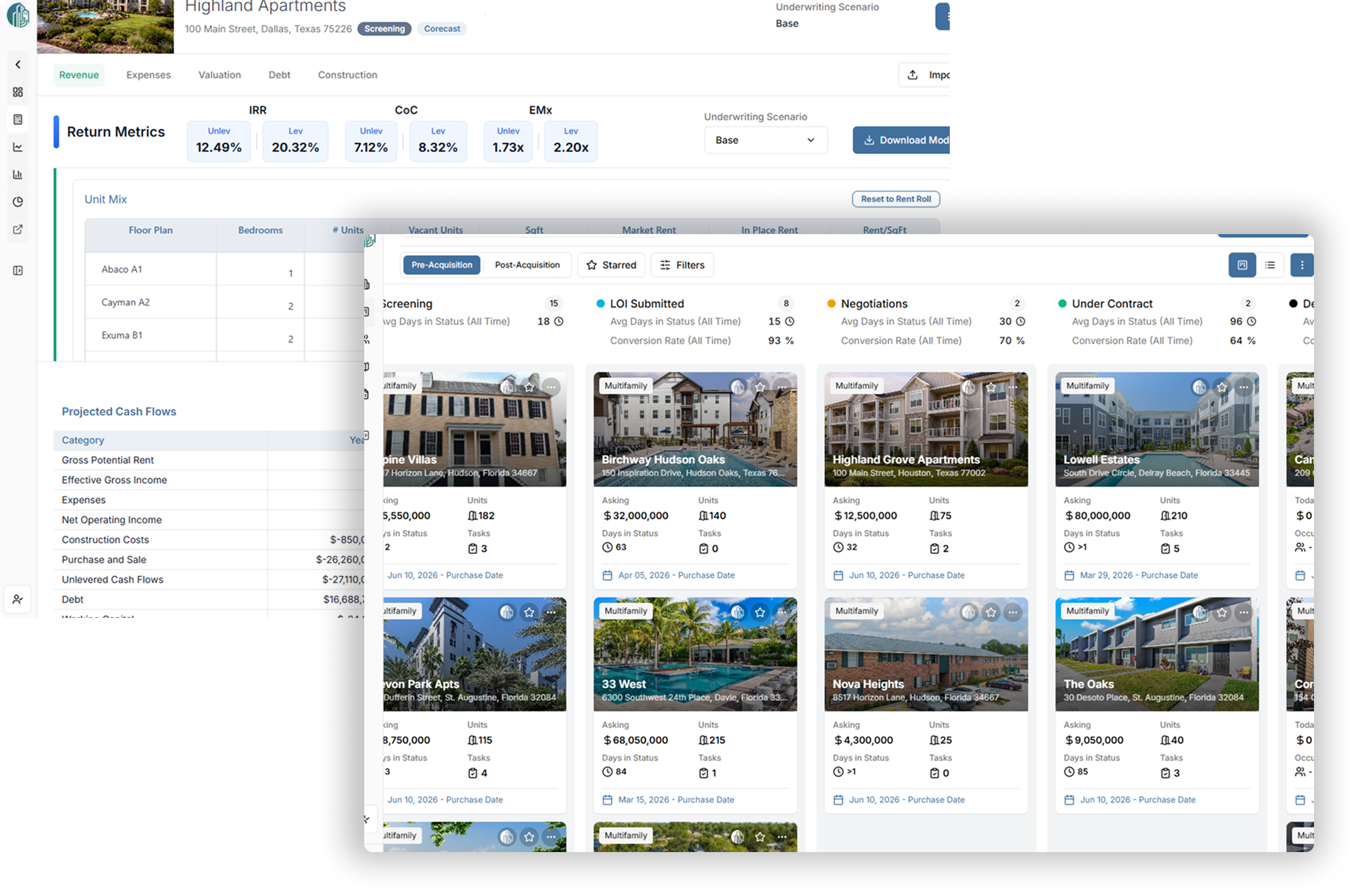 Import OM/T12/Rent Roll, screen deals, track pipeline, and generate investor-ready reporting in one system built for acquisitions teams.